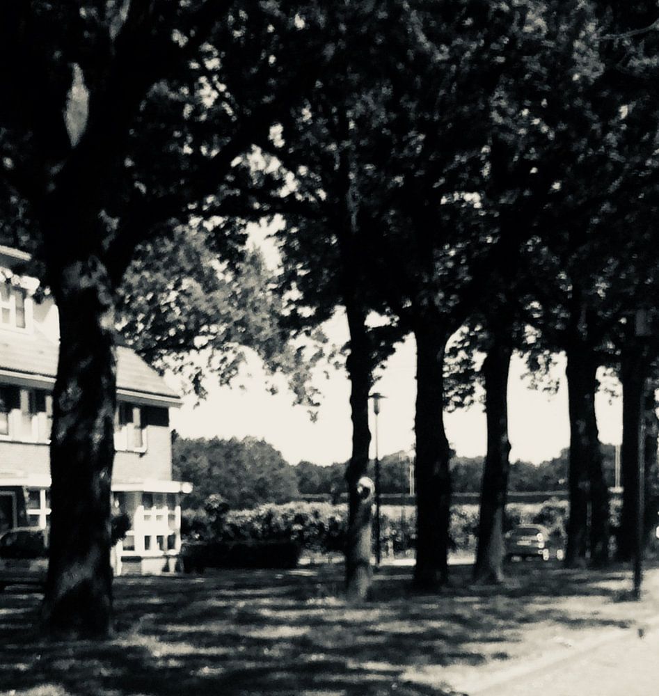 Schönes Bild eines Innenhofes in Apeldoorn, schöne schwarz-weiße Bäume