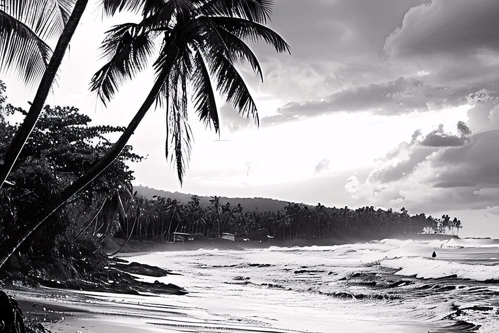 Träumen Sie von sonnenverwöhnten Stränden? Schaffen Sie eine Oase der Ruhe mit diesem heiteren Foto von Palmen an einem schwarz-weißen Strand. Perfekt für jeden Raum, der einen Hauch von tropischer Entspannung braucht.