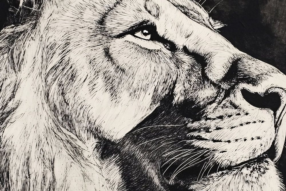 Dieses beeindruckende Schwarz-Weiß-Porträt eines Löwen zeigt die Stärke und Majestät des Tieres. Das Design mit seinen detaillierten Linien und Schattierungen erweckt den Löwen zum Leben und hebt die Textur seiner Mähne und seinen scharfen Blick hervor. Dieses Kunstwerk ist perfekt für Liebhaber von Wildtieren und klassischen Porträts und passt gut in einen ruhigen und stilvollen Raum wie ein Schlafzimmer oder ein Büro. Die monochrome Farbgebung schafft einen zeitlosen Look, und die detaillierten Linien verleihen jedem Raum ein einzigartiges künstlerisches Flair. Eine starke Ergänzung für jedes Interieur!