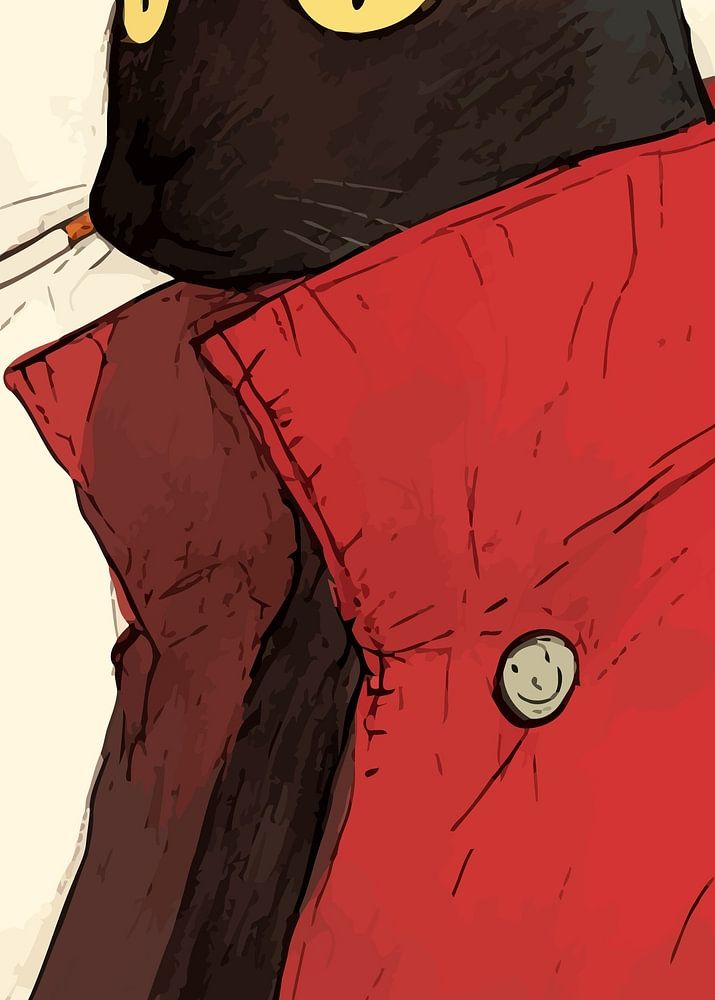In einer skurrilen Cartoon-Welt stolziert eine elegante schwarze Katze in einer leuchtend roten Jacke selbstbewusst umher. Mit einem verspielten Glitzern in den Augen pafft sie an einer kleinen Zigarre und verströmt eine charmant schelmische Stimmung. Die Szene ist lebhaft und lebendig und fängt das coole Auftreten der Katze und ihre Vorliebe für Mode ein und verleiht jedem Abenteuer einen Hauch von Katzenflair.