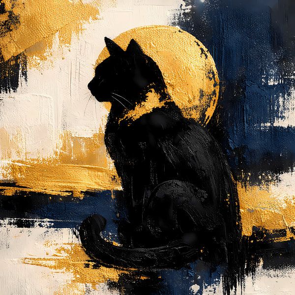Ein ausdrucksstarkes, modernes Kunstwerk, das die Silhouette einer schwarzen Katze vor einem leuchtenden goldenen Kreis zeigt. Die kräftigen, strukturierten Pinselstriche in Schwarz, Gold, Blau und Weiß verleihen dem Bild Tiefe und eine edle, mystische Atmosphäre. Die Komposition verbindet Minimalismus mit luxuriöser Farbwirkung und…