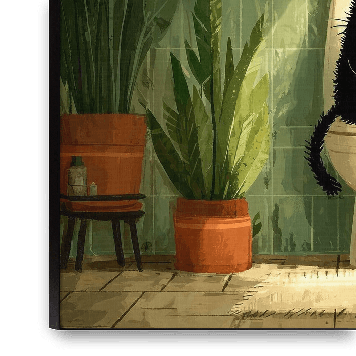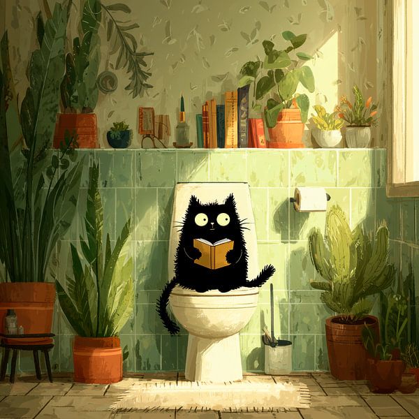 Diese Illustration zeigt eine schwarze Katze in einem ganz besonderen, stillen Moment des Alltags: entspannt sitzend auf der Toilette, vertieft in ein Buch, umgeben von einem gemütlichen Badezimmer voller Pflanzen und weichem Licht. Die Szene verbindet leisen Humor mit Ruhe und schafft eine Atmosphäre, die zugleich vertraut und…