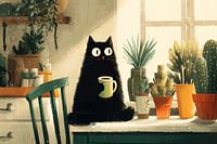 Bestelle das digitale Kunst Bild Schwarze Katze mit Tasse am Fenster von Erika Kaisersot als Reproduktion auf Leinwand, Alu-Dibond, als Poster, Fototapete oder Acrylglasbild.