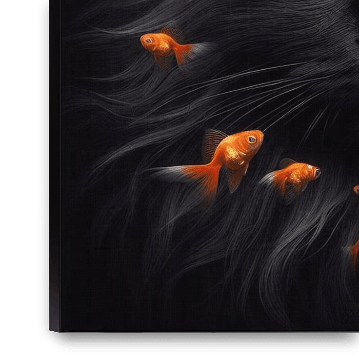 Bestelle das Foto Schwarze Katze mit orangefarbenem Goldfisch von Jessica Berendsen als Reproduktion auf Leinwand, Alu-Dibond, als Poster, Fototapete oder Acrylglasbild.
