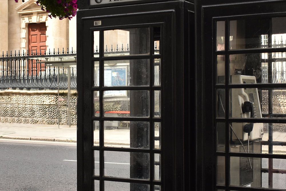 Ein Satz schwarzer Telefonzellen für ein schönes altes Gebäude in London. Der schwarze Laternenpfahl daneben trägt einen Satz hängender Blumen, die dem ansonsten dunklen Bild eine leichte und luftige Note verleihen.