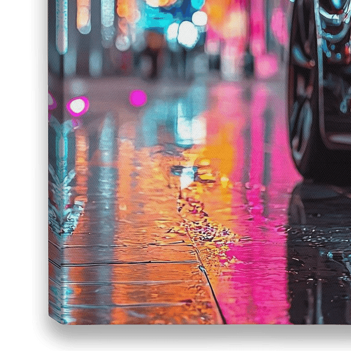 Ein stilvolles Poster mit einem schwarzen Porsche 911 GT3, der im sanften Abendlicht schimmert. Geparkt auf einer nassen, spiegelnden Straße in einer modernen Stadtkulisse, mit Neonlichtern, die subtil auf dem Lack tanzen. Der Himmel ist dunkel, im Hintergrund leuchtet geheimnisvoll die Skyline. Die perfekte Mischung aus Kraft, Luxus…