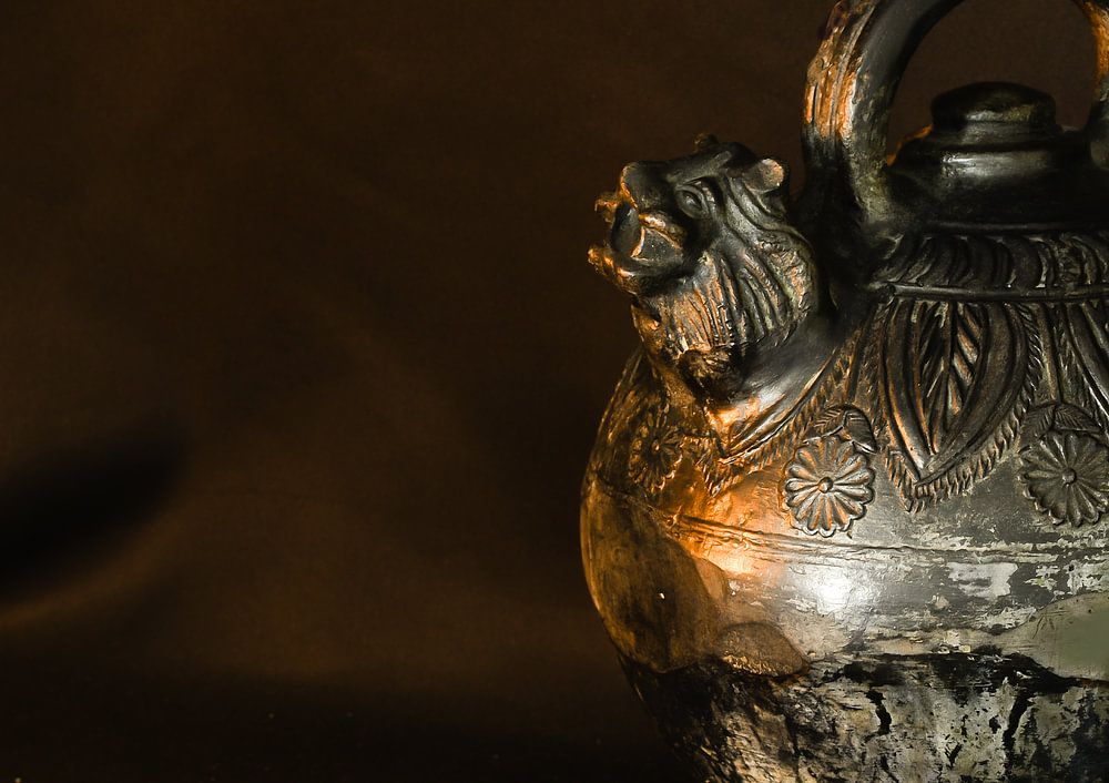 Alter schwarzer Steingut-Weinkrug, mit Abriebspuren, vor schwarzem Hintergrund