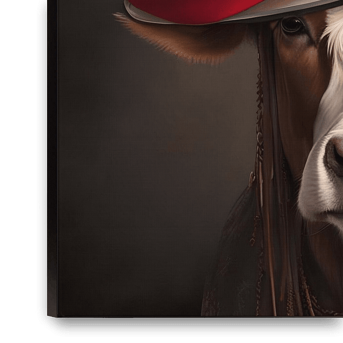 Bestelle dieses Kuh-Wandbild Schwarzwald-Kuh mit Bollenhut von YArt als Reproduktion auf Leinwand, Alu-Dibond, als Poster, Fototapete oder Acrylglasbild.