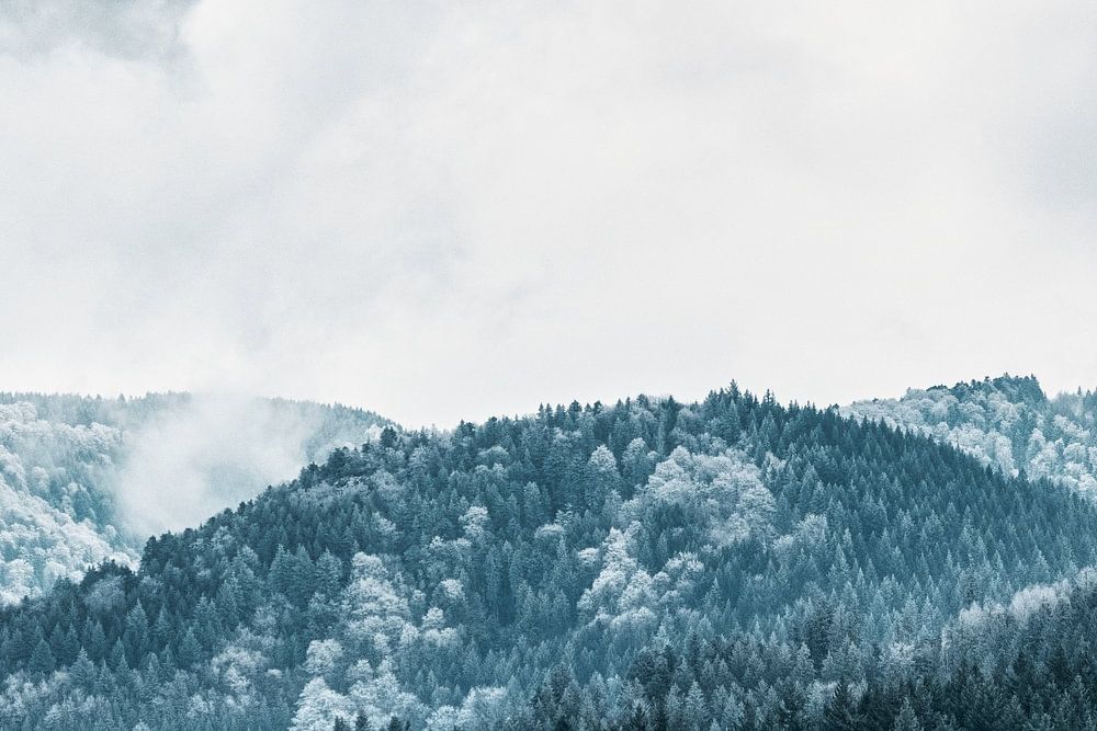 Schneebedeckter Schwarzwald im Winter 2023 bei Oberried. Das Bild entstand an einem bewölkten Tag, was den mächtigen Eindruck des dunklen Waldes verstärkt und dessen Rauheit vergegenwärtigt.