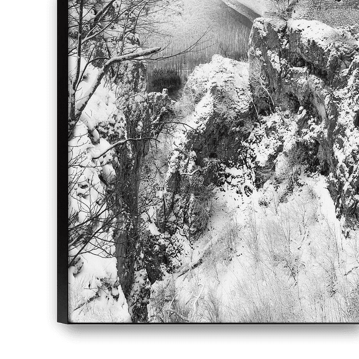Schwarzweiß Bild der Burgruine Reußenstein im Winter bei Schnee. Schwäbische Alb