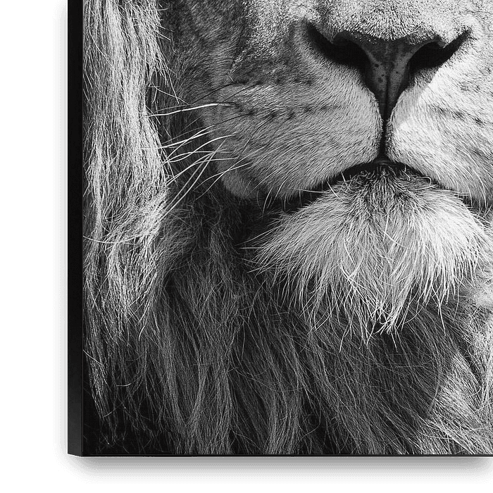 Schwarzweiß-Porträt eines mächtigen männlichen Löwen mit Mähne und imposantem Gesicht