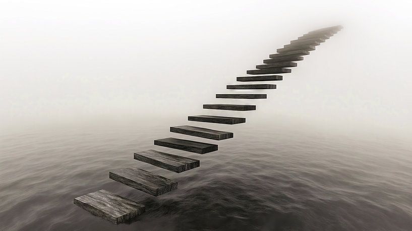 Eine hölzerne Treppe schwebt auf ruhigem Wasser und führt in dichten Nebel. Dieses surreale Bild symbolisiert Hoffnung, Glauben, Träume und die Herausforderungen auf dem Weg in eine ungewisse, aber vielversprechende Zukunft.