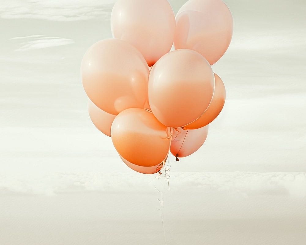 Am Körper des Schweins ist ein Bündel rosa und grüner Luftballons befestigt.