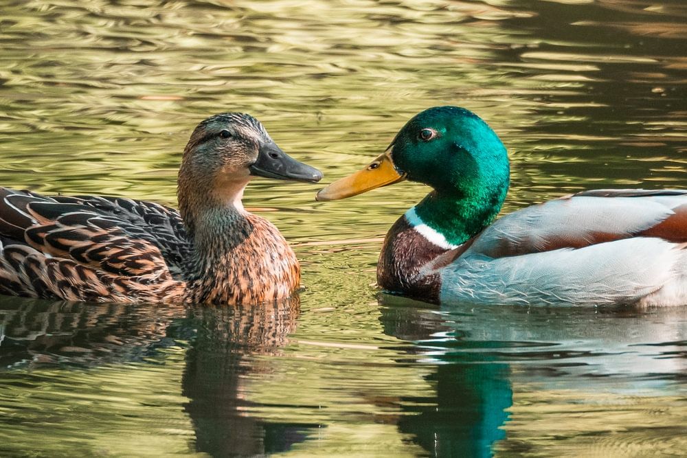 Enten schwimmen in einem kleinen See und zeigen ihre Liebe zueinander