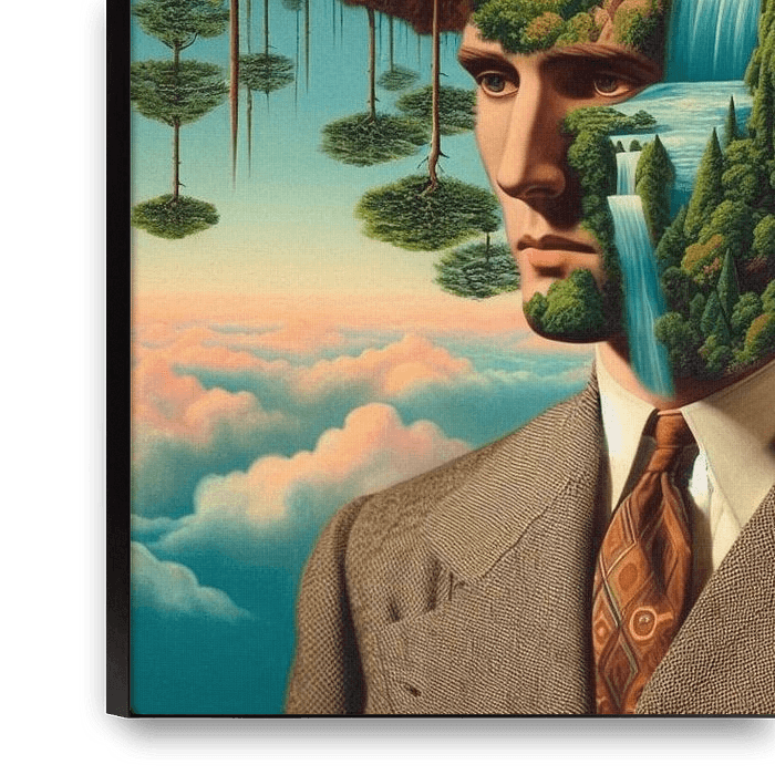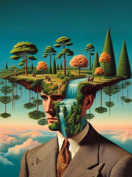 Ein surrealistisches Porträt, das einen Mann zeigt, dessen Kopf sich in eine schwebende Insellandschaft verwandelt. Üppiges Grün und eine ruhige Landschaft verschmelzen mit der menschlichen Gestalt und symbolisieren Fantasie und innere Welten.