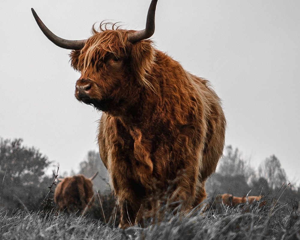Schottischer Highlander auf dem Feld im Naturreservat Schotsman, Zeeland. Horizontale Version.