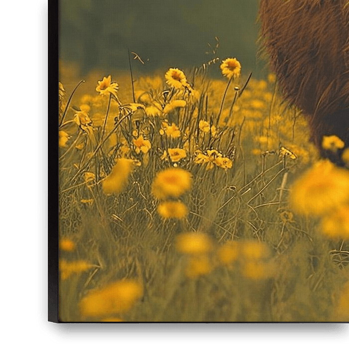 Dieses Kunstwerk zeigt eine friedliche Szene mit einer schottischen Hochländerin und ihrem Kalb, die in einem Feld voller gelber Blumen stehen.