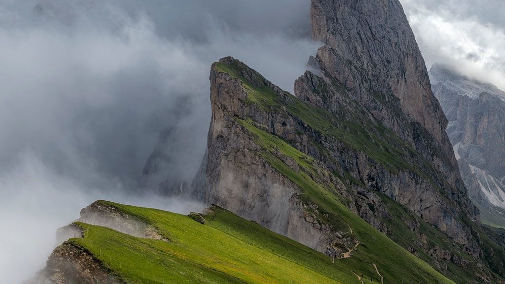 Die Seceda in den Dolomiten, umgeben von Nebel und Wolken