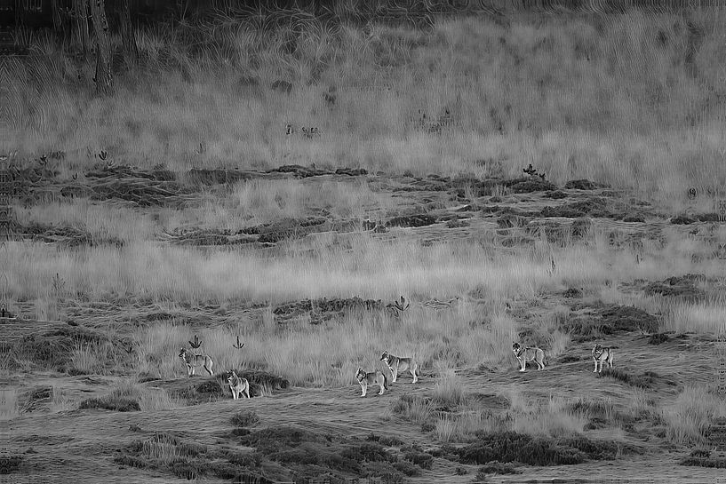 Bestelle dieses Landschafts-Wandbild Sechs Wölfe von joas wilzing als Reproduktion auf Leinwand, Alu-Dibond, als Poster, Fototapete oder Acrylglasbild.