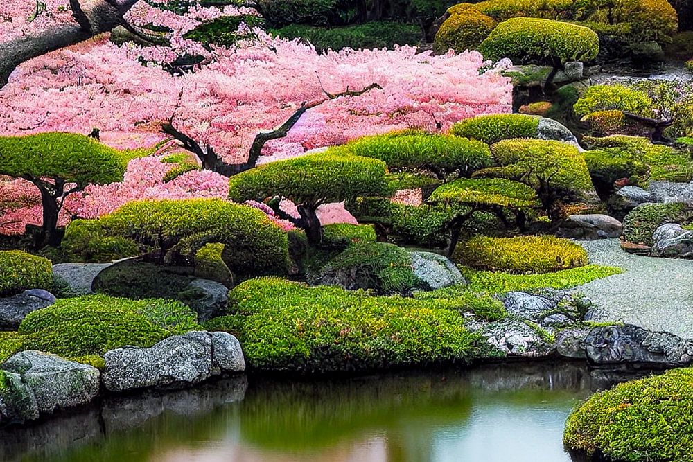 See mit blühenden Baum in einem Japanischen Garten