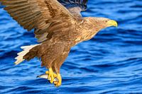 Seeadler bei der Jagd in einem Fjord in der Nähe der Insel Vesteralen in Nordnorwegen an einem frühen Wintermorgen.
