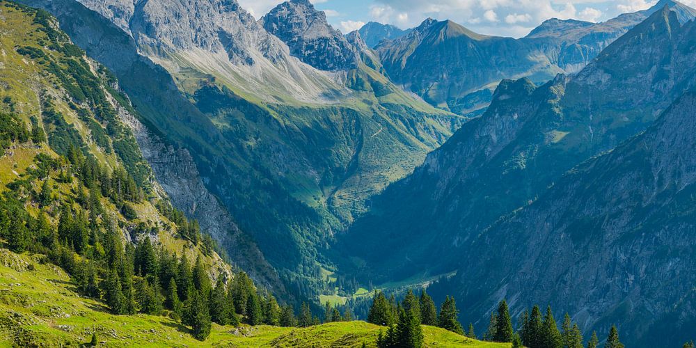 Panorama über den Seealpsee, dahinter das Oytal und v.l.n.r. Großer Wilder, 2379m, Kleiner Wilder, 2306m und Höfats 2259m, Allgäuer Alpen, Allgäu, Bayern, Deutschland, Europa