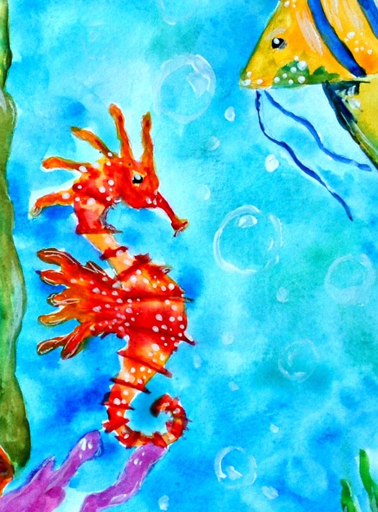 ein traditionelles Wasserfarben Kunstwerk von einer Unterwasser Szene in einem Korallenriff, wo ein kleines Seepferdchen und ein kleiner Fische beste Freunde zu sein scheinen.