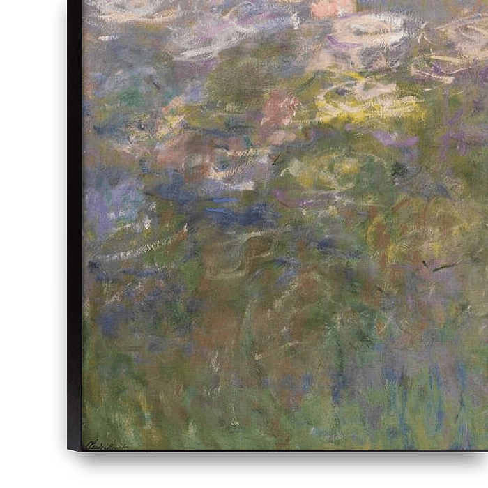 Impressionistische Ansicht des Sees mit drei Hauptgruppen von Seerosen, Mitte links, links und oben rechts, kleine Gruppe unten rechts. Erhältlich in grün, blau, blau, pink, lila und weiß.
