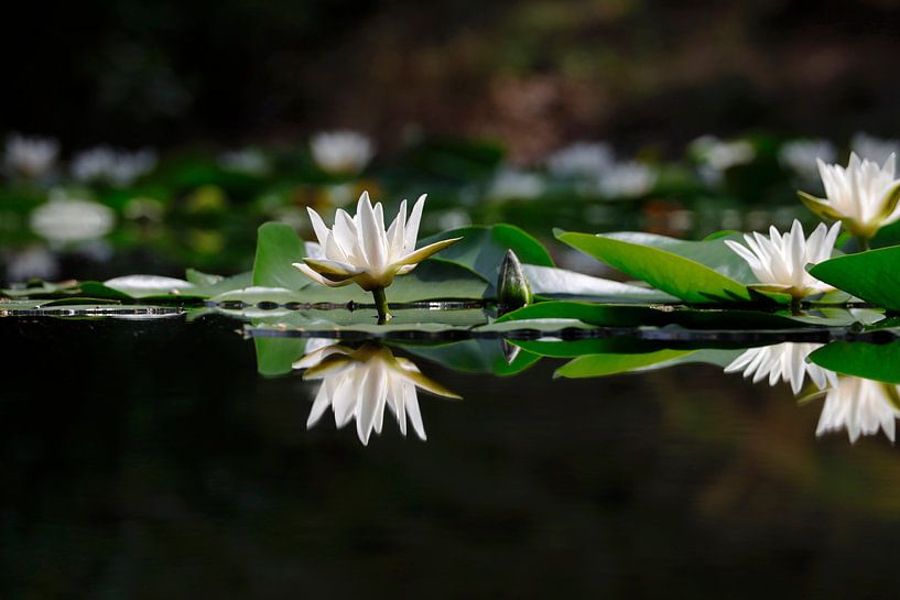 Bestelle dieses Blumen-Wandbild Seerosenspiegelung von Thomas Jäger als Reproduktion auf Leinwand, Alu-Dibond, als Poster, Fototapete oder Acrylglasbild.