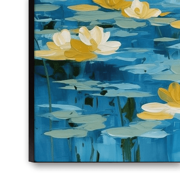 Ein Teich mit Seerosen, abstrakter Impressionismus in hauptsächlich blauen, weißen und gelben Farbtönen.