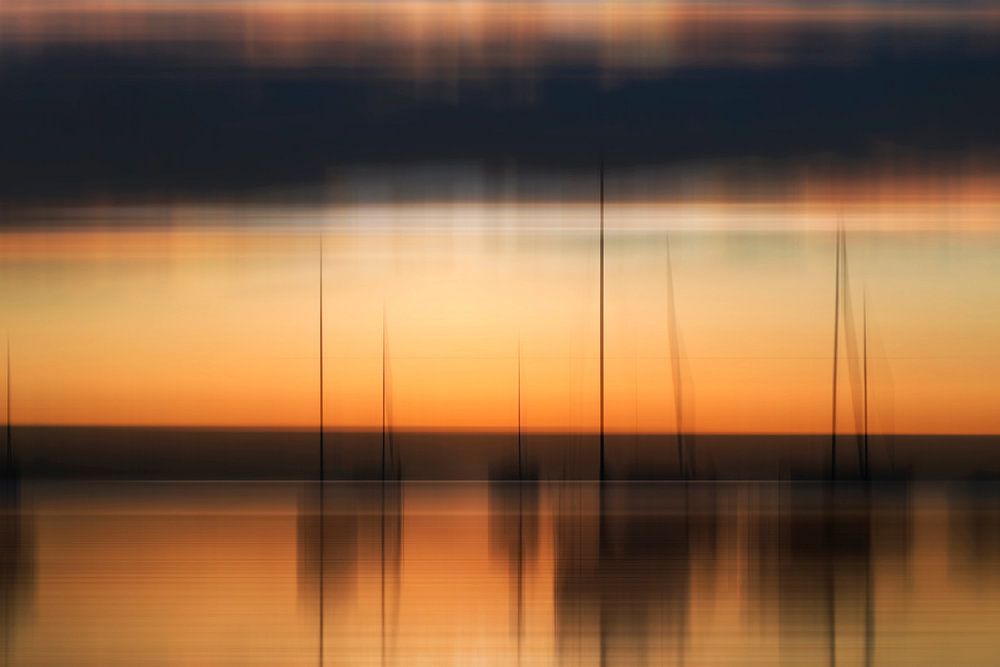 Malerischer See mit Segelbooten an einem Sommerabend, verfremdet