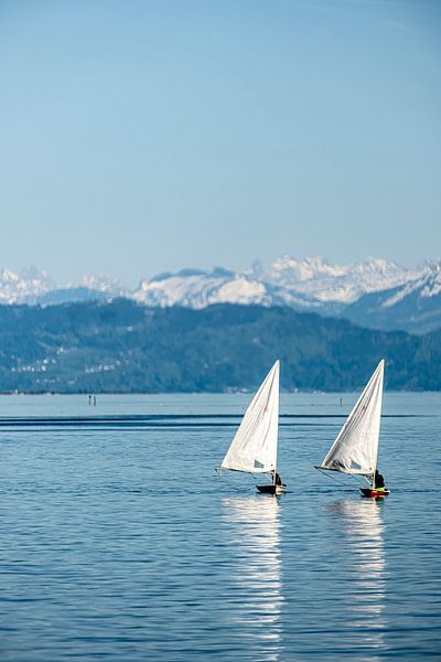 Zwei Segelboote einer Segelschule als Duo auf dem Bodensee in Deutschland vor Landschaft mit Schnee bedeckten schweizer Alpen im Frühling