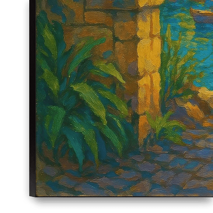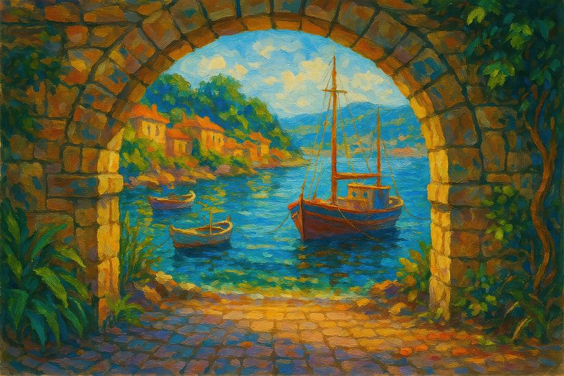 Ein verwitterter Steinbogen umrahmt eine ruhige Bucht, in der Segelboote sanft schaukeln. Im Vordergrund liegt ein Kopfsteinpflasterweg mit warmen Schatten, während weiter entfernt terrakottafarbene Häuser in der Sonne leuchten. Das Wasser wechselt zwischen Kobaltblau und Türkis, mit Schimmern um die Rümpfe herum. Kletterpflanzen ranken…