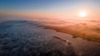 Dichte Nebelbänke ziehen vom Ooijpolder die Waal hinauf. Ein Boot bahnt sich seinen Weg durch den Nebel. An Herbstmorgen wie diesem gibt es oft die Chance auf Nebel, und der sorgt für schöne Bilder, besonders wenn man mit einer Drohne über den Nebel fliegen kann.