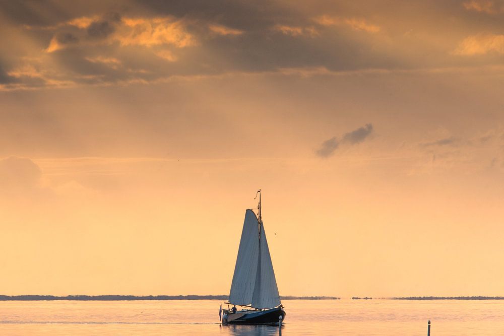 Ein ruhiger und farbenfroher Spätsommerabend auf dem IJsselmeer in der Nähe der friesischen Stadt Stavoren mit nur einem Segelschiff auf dem Wasser.