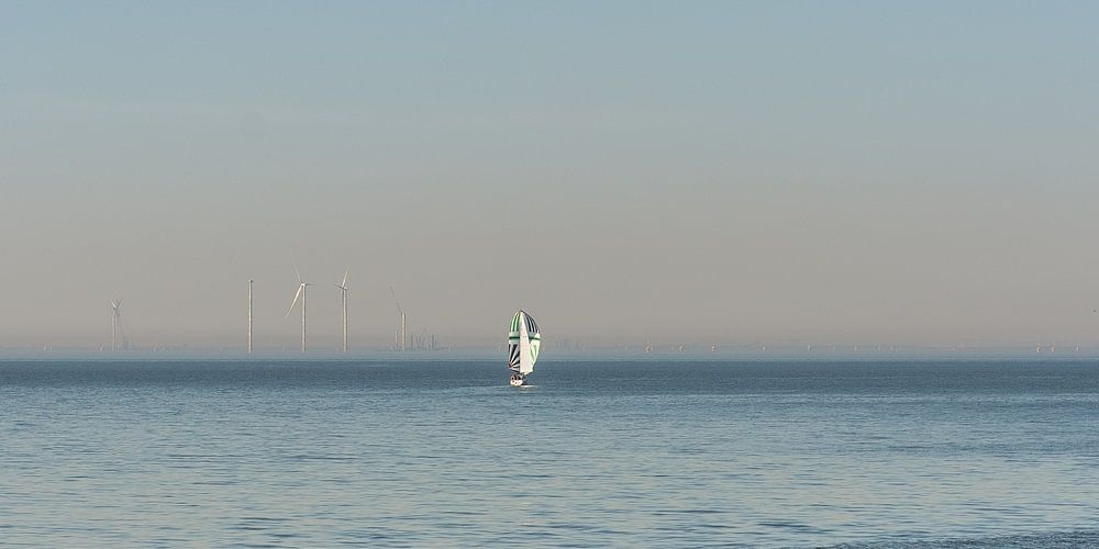 Segelschiff auf dem fast leeren IJsselmeer bei Stavoren am 30. März 2021, wo die Strömung verschiedene Blautöne verursacht.