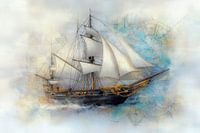 Bestelle Segelschiff auf See – Elegante Zeichnung von Peter Pen Zeichnungen und Gemälde als Reproduktion auf Leinwand, Alu-Dibond, als Poster, Fototapete oder Acrylglasbild.