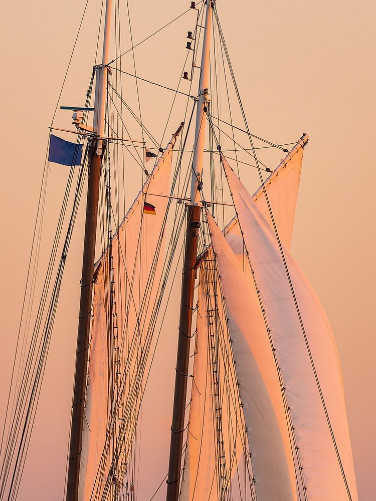Segelschiff im Sonnenuntergang auf der Hanse Sail in Rostock.
