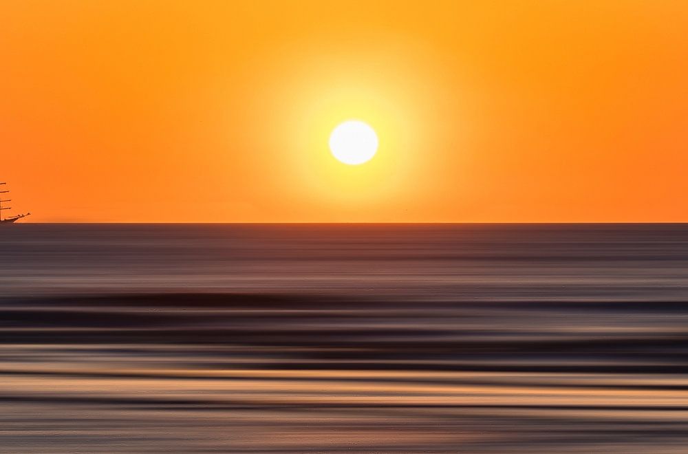 Ein dreimastiges Segelschiff fährt dem Sonnenuntergang hinterher. Ein Blick vom Strand in der Nähe von Bergen aan Zee auf die Nordsee, in der die glühende Sommersonne versinkt. Die Wellen wirken abstrakt und surreal. Romantik pur.