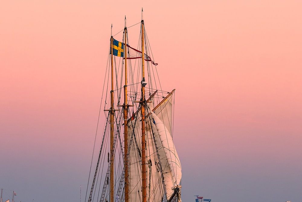 Segelschiffe im Sonnenuntergang auf der Hanse Sail in Rostock.