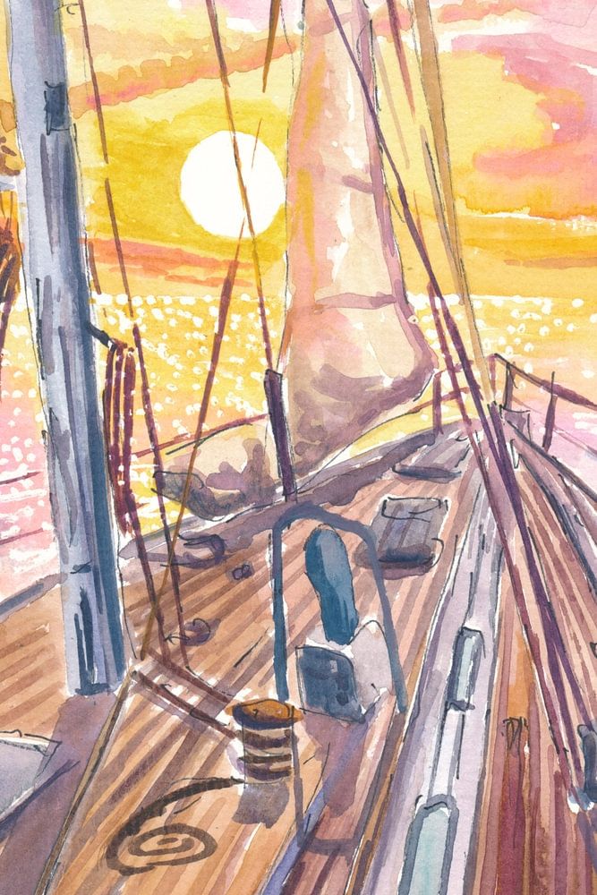 Segelyacht mit Bugdeck, das den Flammen der untergehenden Sonne zugewandt ist