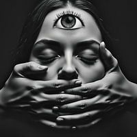 In einem surrealen Porträt erscheint eine Frau mit einem Auge auf der Stirn, die neugierig die Welt um sich herum beobachtet. Dieses mystische Auge symbolisiert Einsicht und Bewusstsein, wie ein Fenster zu den tieferen Schichten der Seele. Vor ihrem Mund befinden sich seltsame Hände, die ein Gefühl der Verschwiegenheit und des Schutzes…