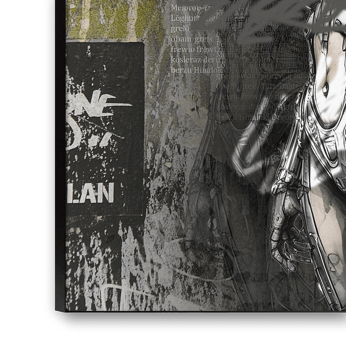 Dieses Bild erzeugt eine emotionale Atmosphäre, die von kühler Anmut, Melancholie und einer tiefen Zerrissenheit geprägt ist. Die zentrale Figur, eine elegant gezeichnete Frau, die teilweise in eine filigrane, metallische Rüstung (Cyberpunk-Stil) gehüllt ist, strahlt eine ruhige, aber tiefgründige Intensität aus. Ihr direkter, warmer Blick im Kontrast zur kalten Mechanik ihrer Rüstung erzeugt eine emotionale Spannung zwischen Menschlichkeit und Technologie. Die Farbwahl ist gedämpft: Grau, Schwarz und Weiß dominieren, akzentuiert durch subtile gelbe und grüne Farbflecken. Diese Töne vermitteln ein Gefühl von Vergänglichkeit und Verfall, typisch für die raue Ästhetik des Streetlife. Die Überlagerung mit dichtem, pseudo-literarischem Text und der Silhouette eines springenden Mannes im Hintergrund verstärken das Gefühl der Einsamkeit und der Komplexität des urbanen Lebens. Die Figur wirkt wie eine elegante Beobachterin inmitten des Chaos. Besonders emotional wirksam ist die schattenhafte Verdopplung der Figur auf der linken Seite. Diese Wiederholung suggeriert eine doppelte Identität oder eine Vergangenheit, die die Protagonistin verfolgt, was ein Gefühl von Rätselhaftigkeit und innerer Konflikt auslöst. Die schwarzen und weißen, flügelartigen Elemente, die scheinbar aus ihr hervorbrechen, deuten auf einen inneren oder kämpferischen Zustand hin. Das Bild ruft Gefühle der Sehnsucht nach Beständigkeit und der stillen Resignation angesichts der urbanen Hektik hervor.
