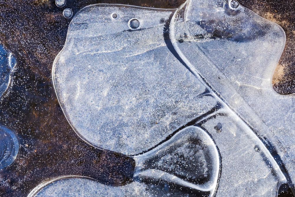 Fantasieszene im Eis, spontan in der Natur entstanden. Das Wasser am Boden ist gefroren, so dass diese Eisstrukturen in Blau und Weiß entstanden sind. Es entsteht abstrakte Kunst. Es sieht aus, als ob eine Glocke nach oben geblasen wird.