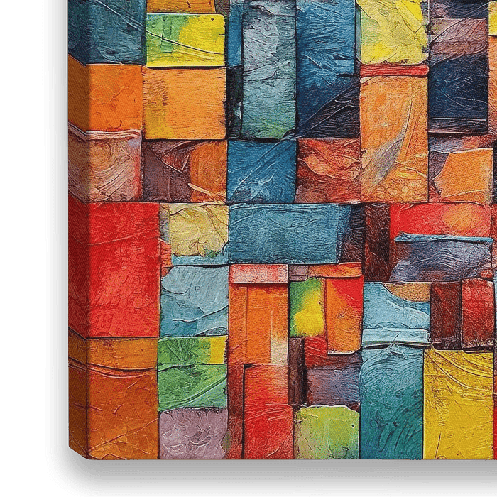 Ein abstraktes kubistisches Kunstwerk mit geometrischen Formen, die aus mehreren Schichten von Quadraten und Rechtecken in verschiedenen Erdtönen bestehen. Der Hintergrund ist mit einer Reihe von bunten Blöcken gefüllt, die in einem Gittermuster angeordnet sind, wodurch eine strukturierte Oberfläche entsteht, die der Komposition Tiefe…