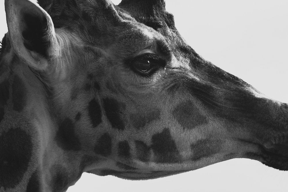 Diese Giraffe kam und stellte sich direkt neben uns, um uns im Auge zu behalten, bevor sie sich wieder den Blättern in den Baumkronen widmete. Ich habe dieses Foto in schwarz-weiß gehalten, um ihm zusätzliche Kraft zu verleihen.