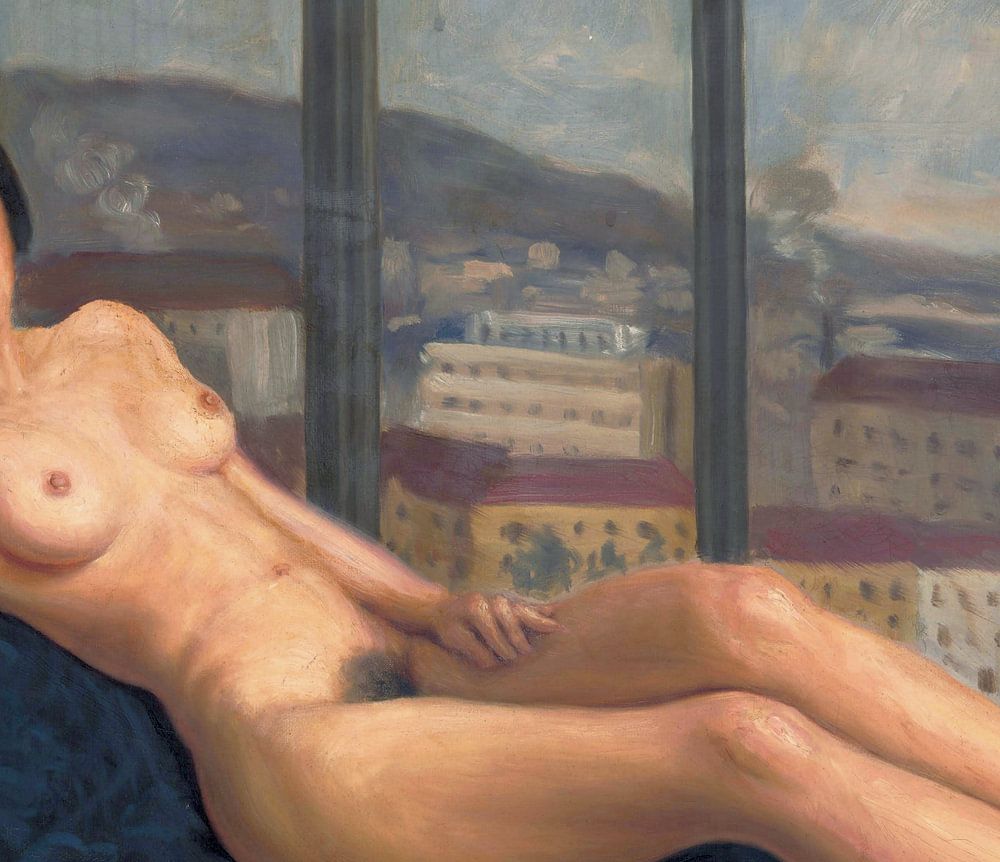 Aktporträt einer Frau auf einem Diwan vor dem Fenster eines Penthouses mit einer Stadtlandschaft mit hohen Wohnhäusern, Wohnkomplexen im Hintergrund. Das Aktmodell leuchtet auf und schaut den Künstler an.