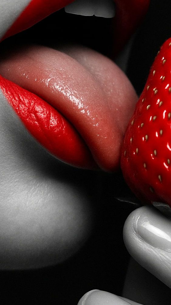 Dieses verführerische Kunstwerk zeigt eine Nahaufnahme von leuchtend roten Lippen, die sinnlich eine Erdbeere berühren. Die Kombination aus weichen schwarzen und weißen Hauttönen mit den intensiven roten Reflexen der Lippen und der Frucht macht dieses Bild unwiderstehlich und fällt sofort auf. Das Zusammenspiel von Kontrast und Farbe verleiht dem Bild ein kraftvolles und modernes Aussehen, bei dem Sinnlichkeit und Verspieltheit im Vordergrund stehen.