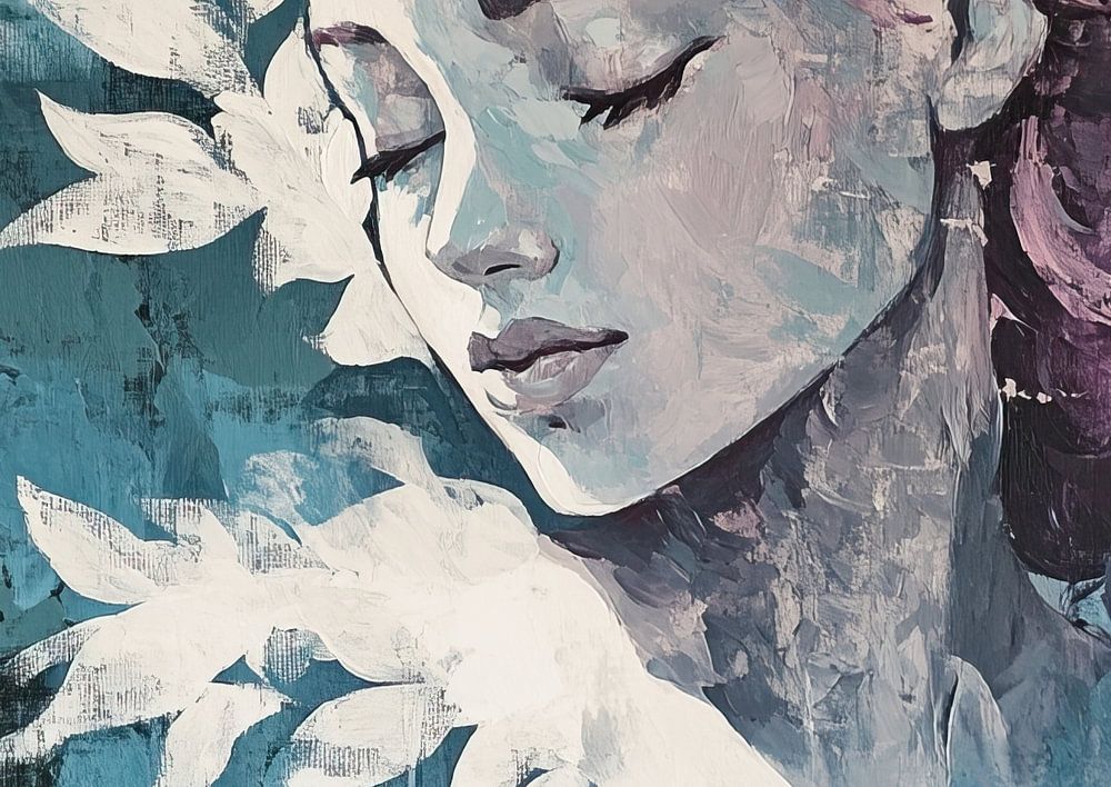 Serene Beauty Flowers - Dieses weibliche Porträtgemälde zeigt eine ruhige Frau mit geschlossenen Augen, die von großen, abstrakten Blumen in Weiß- und Violetttönen vor einem lebhaften, strukturierten blauen Hintergrund umgeben und mit diesen verschmolzen ist.