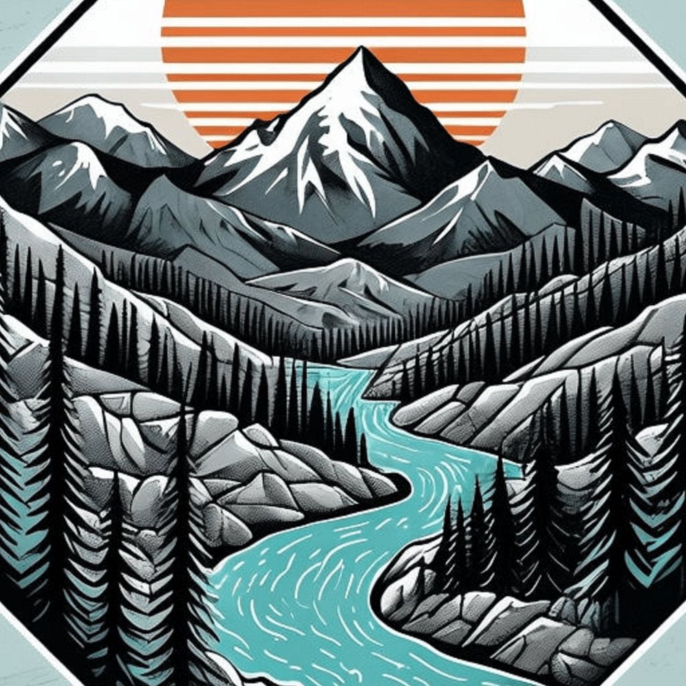 Eine fesselnde Illustration im Retro-Stil, die eine majestätische Berglandschaft mit einem gewundenen türkisfarbenen Fluss zeigt, der durch einen dichten Kiefernwald fließt. Eine leuchtend orangefarbene Sonne mit horizontalen Strahlen geht hinter den zerklüfteten Gipfeln unter, eingerahmt von einer markanten Rautenform. Der rustikale, strukturierte Hintergrund des Bildes weckt das Gefühl von Abenteuer und Natur.